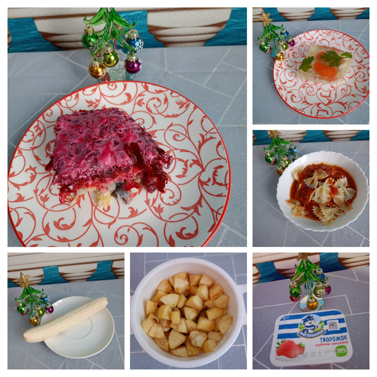 •Обед в 12.45 - сельдь под шубой; холодец из куриной грудки; макароны бантики с овощами в томатном соусе.