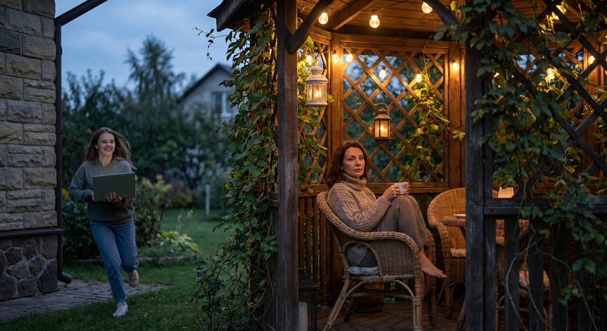 Вечером Аля сидела в беседке и всё ещё пыталась осмыслить утреннюю встречу с Игорем и его «партнёршей по проекту». В голове крутилось: «Реалити‑шоу? Серьёзно? И это человек, у которого жена открыто изменяет с моим мужем…»