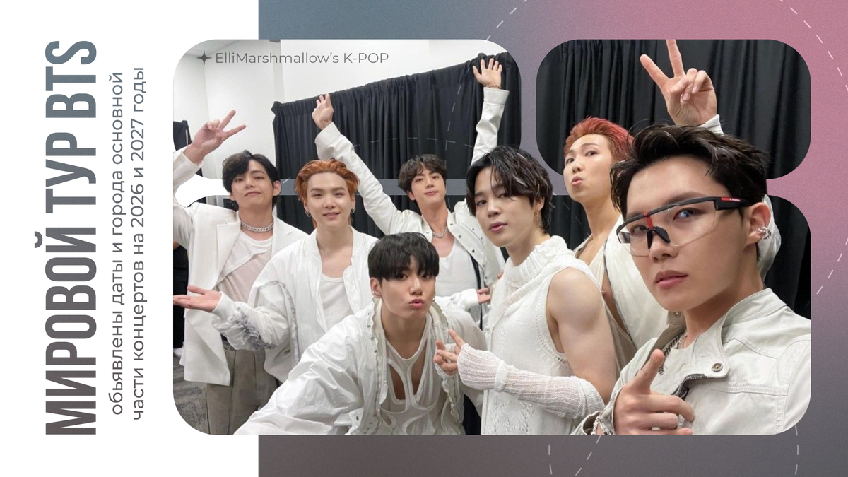 Мировой тур BTS официально объявлен! 14 января в полночь по Корее на официальной фан-платформе weverse появился целый ряд уведомлений о том, что в апреле начнется тур в поддержку нового альбома BTS – первого выпущенного полным составом группы после окончания службы, и первого за почти 4 года с момента выхода альбома-антологии PROOF в 2022 году. Сам альбом выйдет 20 марта и пока о нем очень мало известно, но на днях уже откроется предзаказ, а пока кое-какую информацию я собрала здесь: Так вот, мировой тур! В текущих геопoлитических условиях сложно было рассчитывать на то, что наша страна попадет в их понимание “мира”... Однако грядущий тур поражает своими масштабами. Только задумайтесь: концерты, даты которых уже сообщили, охватывают целый год с апреля 2026 по март 2027, а еще обещают дополнительные даты в Японии, на Ближнем Востоке и, я уверена, будут энкор-концерты в Корее в самом конце тура. Но об этом позже. В данный момент уже открыты предрегистрации на открывающие концерты в Коян
