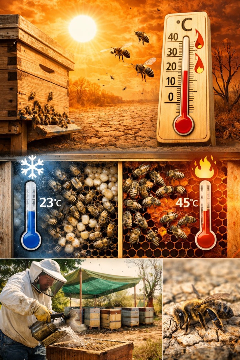 Новое исследование, опубликованное в журнале Ecological and Evolutionary Physiology, показывает, что экстремальная жара нарушает естественную систему охлаждения ульев медоносных пчёл. Обычно пчёлы способны поддерживать внутри гнезда оптимальную температуру (около 34–36 °C), необходимую для развития расплода. Однако при продолжительных экстремальных температурах (выше ~40 °C) их механизм терморегуляции оказывается перегруженным. В таких условиях внутри улья появляются широкие колебания температуры, особенно в периферийных зонах, где молодые пчёлы могут находиться слишком холодно или слишком жарко в течение нескольких часов в день. Исследователи обнаружили, что в небольших колониях эти колебания особенно сильны, что приводит к снижению численности пчёл. Большие семьи лучше справляются с тепловым стрессом, так как внутри них температура колеблется меньше. Ученые предупреждают, что с усилением глобального потепления экстремальные тепловые волны будут становиться все более частыми, что усу