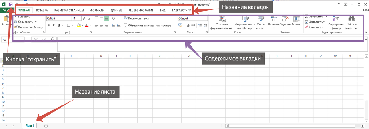 При открытии Excel встречает нас следующим окном. Давайте разберёмся что видим: В самом верху мы видим кнопку 💾 (сохранить) для фиксации внесенных изменений. Чуть ниже идут вкладки: Главная, Вставка, Разметка страницы, Формулы, Данные, Рецензирование, Вид, Разработчик (при подключении). В каждой вкладке сгруппированы логически соответствующие функции Excel, что мы рассмотрим далее. Также левее вкладок имеется кнопка Файл, которая при нажатии вызывает меню. Содержимое: Рассмотрим раздел Сохранить как В данном случае нам предлагается выбрать папку для сохранения файлов. Причем можно выбрать одну Последних открытых папок либо нажать Обзор для самостоятельного выбора папки После выбора в данном меню места сохранения откроется соответствующая папки и нам будет предложено придумать имя файлу. Автоматически файлу присваивается расширешние xlsx, но его можно сменить выбрав во всплывающем списке Тип файла. Как видно по списку типов файлов, возможна смена расширения на xls (Книга Excel 97-