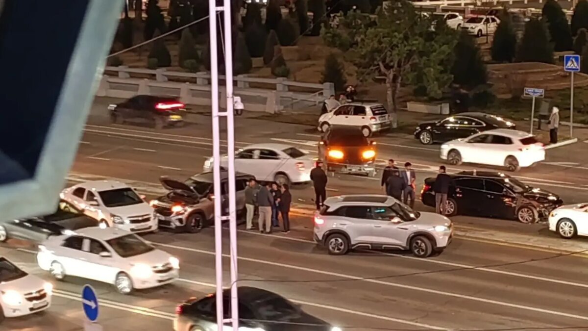 Вечером 14 января в центре Ташкента, перед Алайским базаром, произошло серьезное дорожно-транспортное происшествие. По предварительным данным, зафиксировано цепное столкновение с участием как минимум шести автомобилей. По словам очевидцев и на представленных фото видно, что автомобили марок KIA, BYD, Malibu-2, Tracker, Cobalt и Jetour, двигавшиеся в одном направлении, столкнулись друг с другом. В результате аварии у нескольких машин серьезно повреждена передняя часть, а некоторые автомобили утратили возможность движения. Поскольку происшествие случилось на оживленном участке дороги, движение транспорта в этом районе временно затруднилось. На фото видно, что вокруг остановившихся посреди дороги автомобилей собрались водители и пассажиры, некоторые пытались оттолкнуть машины к обочине. Официальной информации о наличии пострадавших пока не поступало. На место прибыли сотрудники дорожно-патрульной службы, которые изучали причины происшествия и проводили работы по восстановлению безопасност