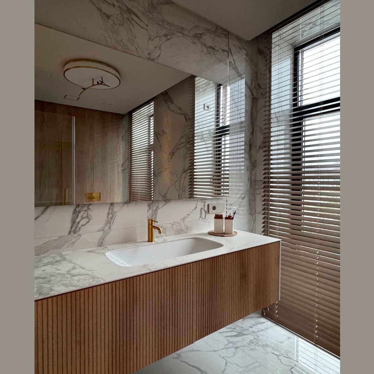 И мы получаем уникальное помещение, где чёткая геометрия деревянных реек сочетается с замысловатыми линиями камня, и вся это игра линий меняется в зависимости от освещения. Здесь мы оформили окна горизонтальными жалюзи на ручном управлении🙌. #деревянныежалюзи #жалюзивванной #нашаработа