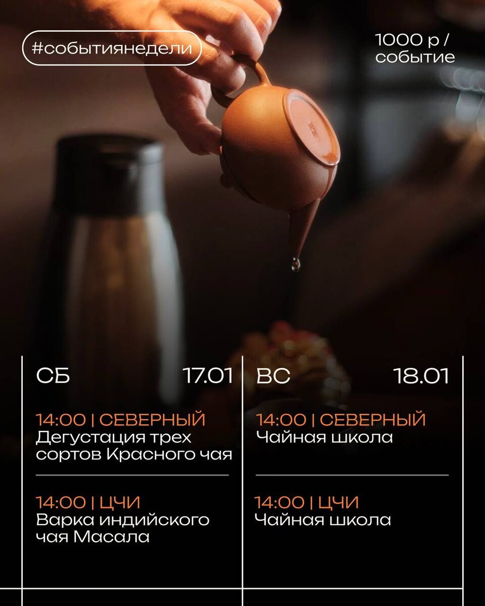 Эту будут самые тёплые и уютные выходные, потому что в Чайной Истории по адресу пр-т. Космонавтов 16/32 мы продегустируем сразу три сорта Красного чая, чтобы ты точно не замерз. А в Центральной Чайной Истории по адресу пер. Театральный, 47 сварим самый зимний напиток - пряный чай Масала. И куда же без Чайной Школы? Традиционно ждём тебя в 14:00 каждое воскресенье. Как записаться? Напиши вот сюда: @chaystory_online