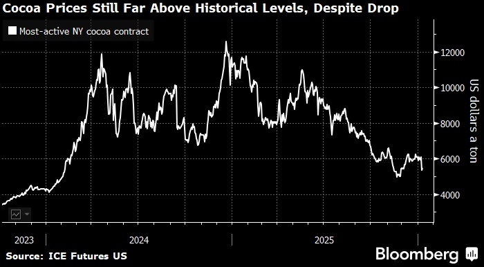 Какао-переработка со стороны производителей шоколада по-прежнему находится под давлением во всем мире, что подчеркивает продолжающееся снижение спроса и трудности, с которыми сталкивается индустрия после рекордных цен годичной давности. График биржевых цен на какао интервалами в 1 день. Согласно усредненным данным опроса 11 аналитиков и трейдеров, проведенного Bloomberg, объем бобов, перемалываемых в масло и порошок для кондитерских изделий в Европе — крупнейшем регионе потребления — в 4 квартале, вероятно, снизился примерно на 3% по сравнению с аналогичным периодом прошлого года. Это самый низкий показатель за 4-й квартал за 11 лет. В Азии объемы переработки, вероятно, упали до десятилетнего минимума, в то время как в Северной Америке они немного выросли. Котировки фьючерсов на какао декабре 2024 года достигли исторического максимума после неурожаев в Западной Африке. Ценовой шок побудил потребителей сократить потребление шоколада, а производители конфет изменили рецепты, используя бо