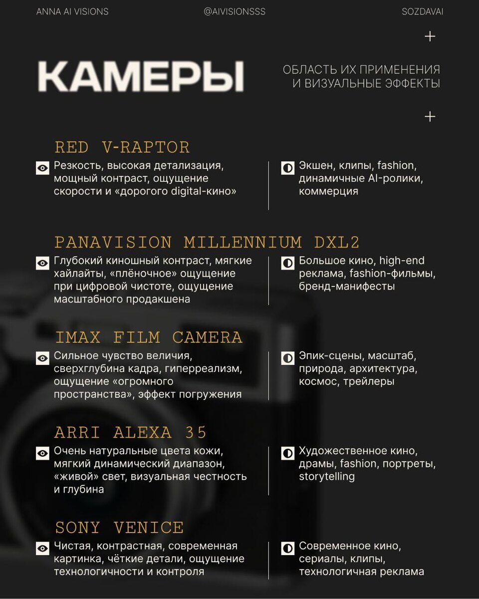 Cinema Studio — это инструмент, где можно создать кинематографичное видео внутри одной платформы, где сам выбираешь, на что снят кадр и как будет двигаться камера. 1️⃣Как работает: • сначала создаём главный кадр, где выбираем из предложенных вариантов на платформе готовые камеру, объектив • далее анимируем его, не переключаясь между разными нейросетями, там же выбираем готовые движения камеры 💡Я сделала для вас шпаргалку по камерам, объективам и линзам, чтобы вы могли уверенно их использовать так же и в других нейронках 2️⃣ Опция “What’s next” Здесь нейросеть сама предлагает до 8 вариантов продолжения сцены, что очень помогает, когда не знаешь, как развить кадр. 3️⃣ Можно загружать референсные изображения, чтобы сохранить одного и того же персонажа и локацию, а также использовать уже созданные кадры как рефы для следующих сцен. 4️⃣ Опция Multishot дает возможность сделать несколько кадров в одной сцене с разными ракурсами 5️⃣ Есть возможность создания переходов между двумя кадра