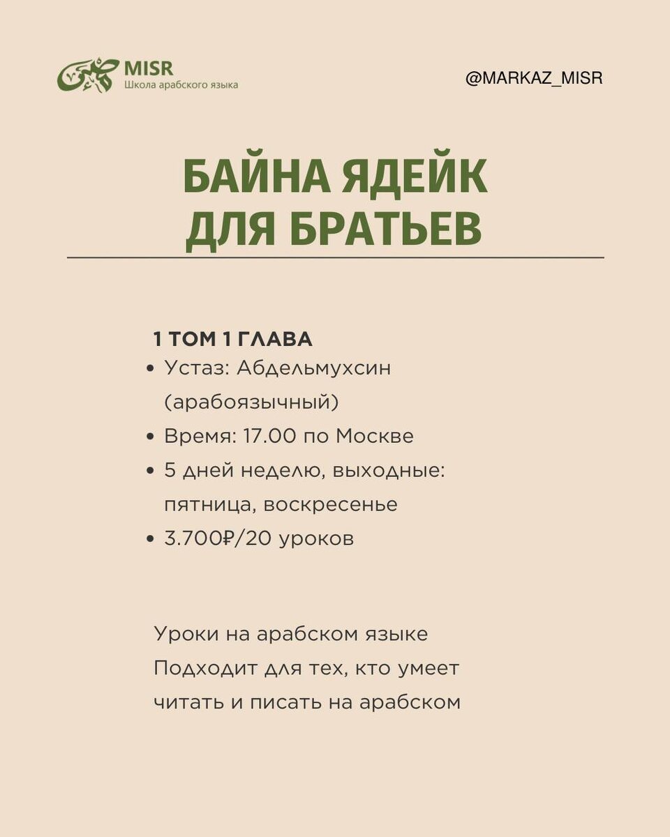Группа в 17.00 по Москве, 1 том 1 глава⬇️ 0️⃣Устаз Абдельмухсин 0️⃣5 раз в неделю 0️⃣выходные пятница, воскресенье 0️⃣для записи на курс нужно уметь читать и писать на арабском 0️⃣запуск группы 19 января, есть еще 1-2 места ✔️Оплата в месяц: 3.700₽/24.200 тенге/48$/20 уроков ➡️Чтобы добавиться в группу, пишите сюда @Markaz_Misr_admin