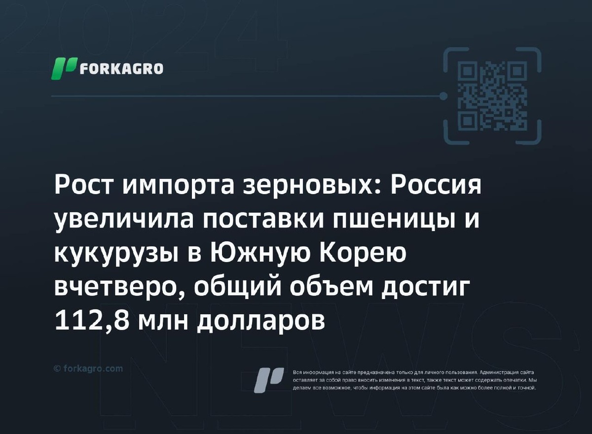 Рост импорта зерновых: Россия увеличила поставки пшеницы и кукурузы в Южную Корею вчетверо, общий объем достиг 112,8 млн долларов