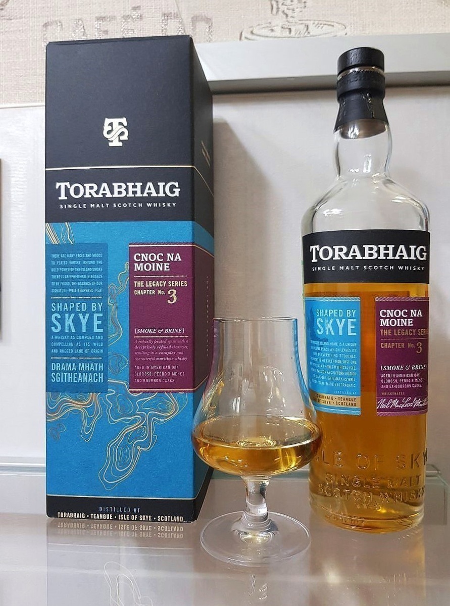 Релиз Cnoc Na Moine ("холм торфа") от винокурни Torabhaig, расположенной в живописном местечке с видом через залив на гору, сильно напоминающую крымский Чатыр-Даг. Тоже островной и торфяной, тоже частично "хересный", как Ардбег Ви Бисти. Близок по крепости (46% против 47,4% у Ви Бисти). По возрасту тоже (примерно, 4 года против 5 лет). Правда, по фенольности на солоде Cnoc Na Moine в полтора раза "торфянистее" (76,8 РРМ против 55 РРМ у Ви Бисти). Однако на выходе, в готовом продукте, за счёт особенностей дистилляции и ферментации, теряет много фенолов и в конечном счёте практически уравнивается с Ви Бисти по "дымности". Torabhaig Legacy Series Ch.3 : Cnoc Na Moine (остров Skye), NAS - (3-5 лет), крепость 46%, фенольность на солоде - 78,4 PPM (на выходе - 19,7 PPM), без колера, без фильтрации, бочки - (Ex-Bourbon, небольшая часть Oloroso + Pedro Ximenez - все американский дуб), бутилирован - январь 23-го. На Вискибазе оценка 84,5 баллов. В обзорах оценку ниже 84 не видел, а только выше