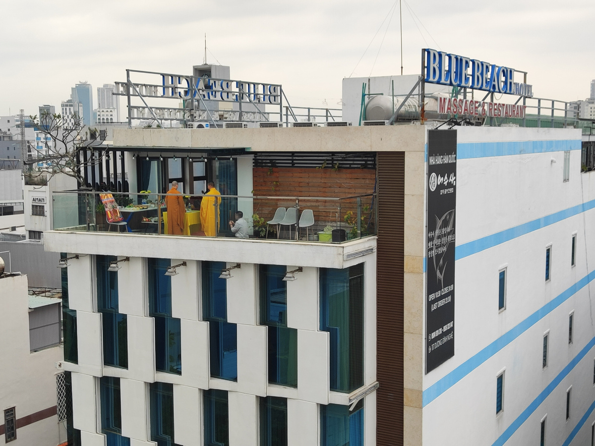 После того, как монахи свое дело закончили, они удалились внутрь здания отеля. А на балкон вышли две девушки-работницы, собрали всю еду в контейнеры, контейнеры поставили в пакеты, и хозяин отнес их монахам.