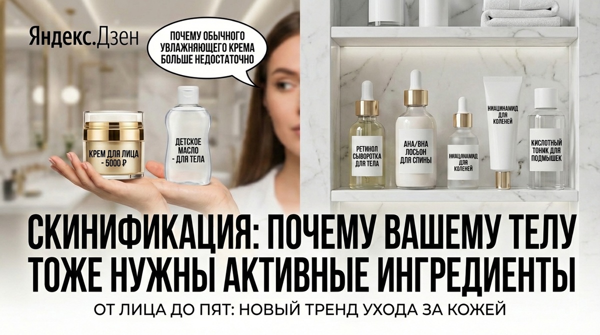 Давайте честно посмотрим на нашу полку в ванной. Для лица у нас там целый арсенал: гидрофильное масло, пенка, тоник, две сыворотки, крем под глаза, крем ночной, маска... А для тела? Одинокий гель для душа (хорошо, если увлажняющий) и, может быть, молочко, про которое мы вспоминаем раз в неделю, когда голени начинают шелушиться. Знакомая картина? Долгое время мы жили по принципу: лицо — это витрина, а тело все равно под одеждой. Но главный мировой тренд 2025–2026 годов — «Скинификация» (Skinification) — переворачивает эту игру. Суть проста: кожа на теле стареет, теряет упругость и страдает от высыпаний точно так же, как и кожа на лице. А значит, ей нужны те же активные ингредиенты, а не просто «вкусненький запах кокоса». Сегодня я расскажу, как превратить уход за телом в работающую систему и почему вам срочно нужно намазать лицо... на пятки. Помните моду на кофейные скрабы, которые царапали кожу до красноты? Забудьте. В эпоху скинификации мы отшелушиваем кожу интеллигентно — кислотами.