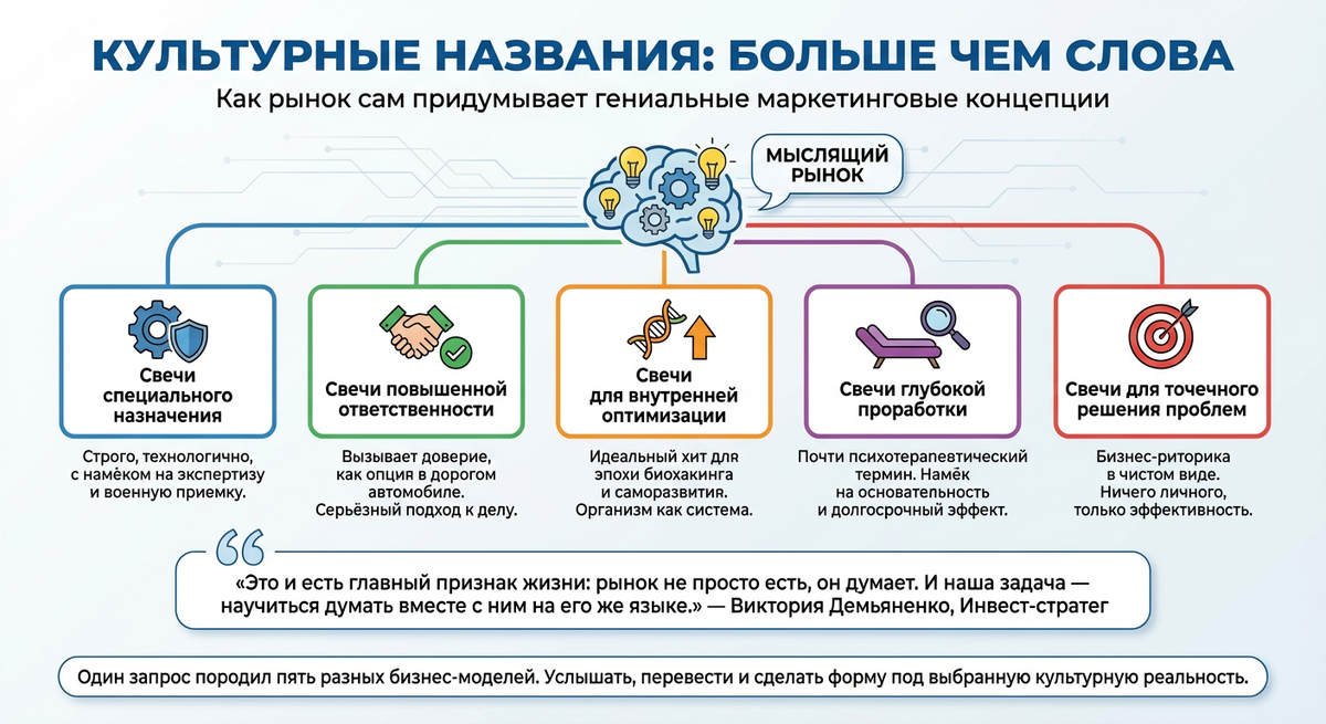 - «Свечи для внутренней оптимизации». Идеальный хит для эпохи биохакинга, ЗОЖ и тотального самоулучшения. Тело — это система, которую нужно тонко настраивать для пиковой производительности. Этот термин встраивает продукт в парадигму заботы о здоровье, питания, спорта и медитаций. Это для тех, кто читает лонгриды про микробиом и ведет таблицы показателей.