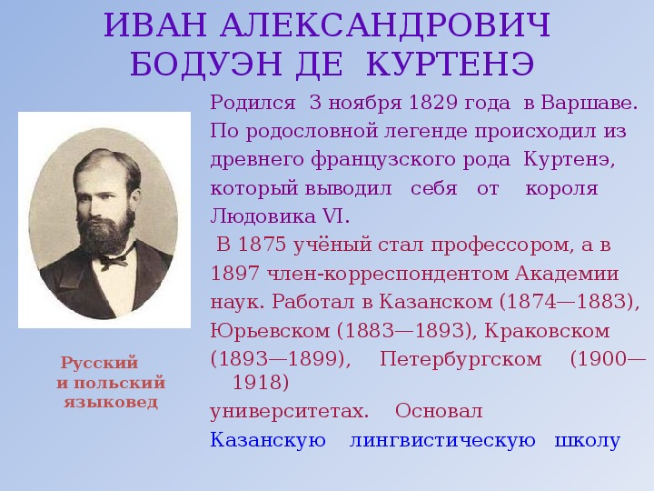 Привет, друзья! Сегодня история о том, как мальчик с неудобной фамилией перевернул мировую лингвистику, посидел в царской тюрьме и чуть не стал президентом Польши. Спойлер: у него это получилось гораздо лучше, чем у многих. 13 марта 1845 года в городке Радмин под Варшавой появился на свет Иван Александрович Бодуэн де Куртенэ. Да-да, вы не ослышались. Французская фамилия, польская кровь, русское имя и отчество. Уже при рождении ему выдали пожизненный абонемент на путаницу в документах и вопросы на границе. Его отец — потомок французских аристократов, сбежавших от революции. Мать — польская патриотка. Дом — островок Польши в Российской империи. Маленький Иван с детства понял: язык — это не то, что в учебнике. Это то, что в твоей голове. И в голове у соседа — совсем другое. А у чиновника на улице — третье. Он рос тихим ребёнком. Пока другие бегали во дворе, Иван осваивал языки, как другие — компьютерные игры. В 7 лет — польский и русский. В 10 — немецкий. Потом — французский. Казалось,