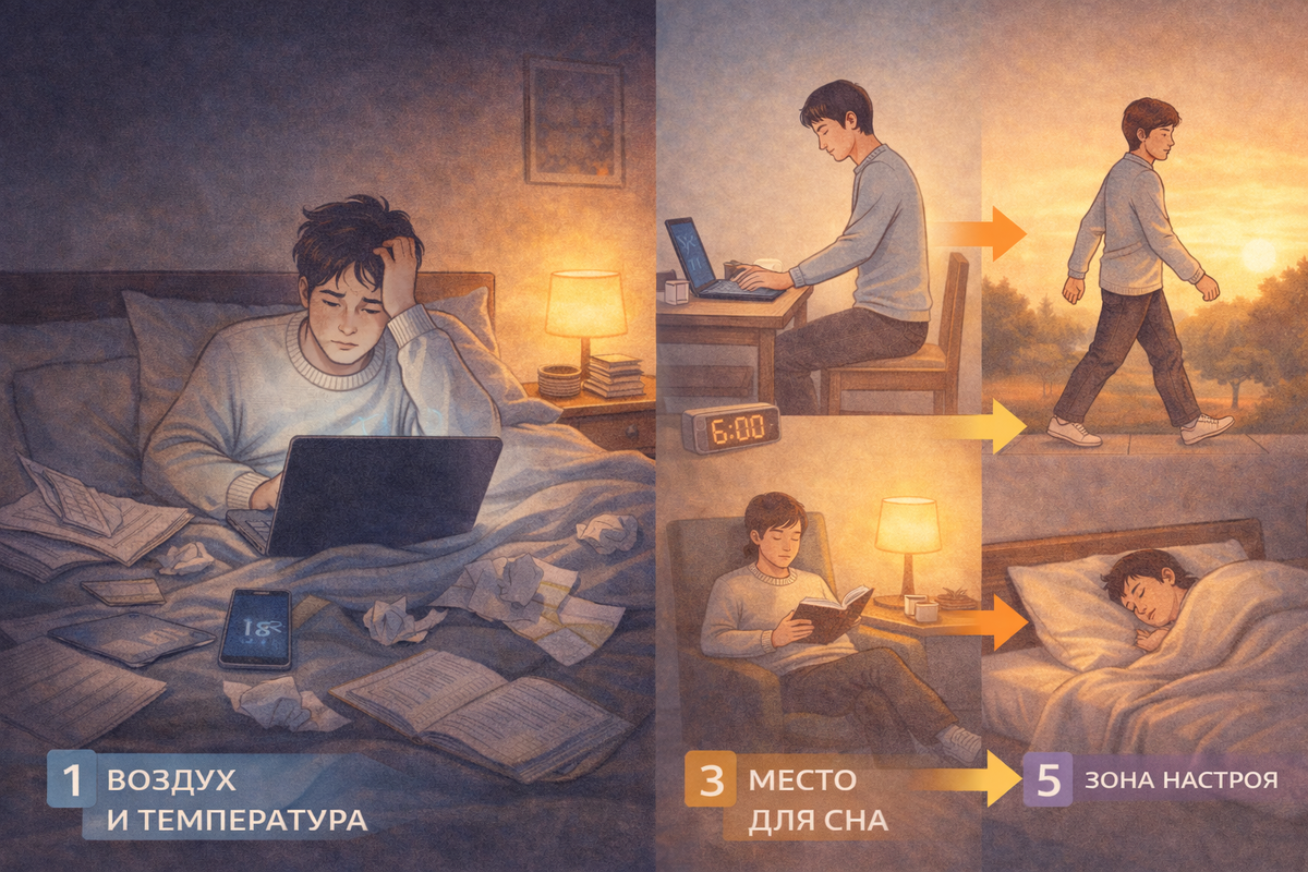 - Если не можете уснуть из-за рабочих мыслей: Воспользуйтесь «правилом 20 минут». Встаньте с кровати, сядьте в другом месте и на бумаге составьте план на завтра. Структурировав хаос, вы уменьшите тревогу.