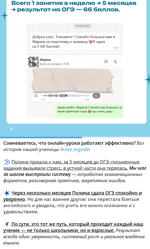 Когда до ОГЭ остаётся всего месяца, у родителей включается очень понятная логика. Экзамен — это задания. Значит, чем больше заданий прорешаем, тем увереннее станет ребёнок 💪 Я вас правда понимаю. Это тот редкий план, который легко объяснить, легко контролировать и приятно «закрывать галочками». И, что важно, в этой идее есть рациональное зерно: когда ребёнок не просто читает правила, а пытается вспомнить и применить — знания закрепляются лучше. Это называют “эффектом тестирования” (testing effect). Проблема начинается там, где «полезная тестовая практика» превращается в марафон пробников. Полный вариант — это сразу всё: аудирование, чтение, грамматика, письмо, говорение (если его тоже тренируют). Ребёнок снова и снова делает то, что у него и так получается, и снова и снова падает в тех же местах, где стабильно теряет баллы. И в таком случае что мы тренируем? 🏋️ Я основала школу английского языка с классными преподавателями (подтвержденный уровень C1 у каждого). Больше полезных матери
