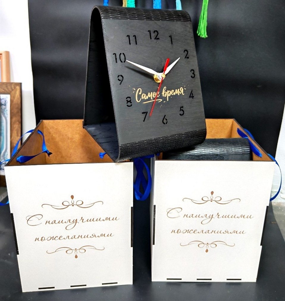 При изготовлении использовали специальный рез, который позволяет изгибать детали, фанера становится гибкой. И в целом часы смотрятся шикарно👍 Для часов также предусмотрена жёсткая коробка с ручками для удобства переноски (перевозки) ☺️