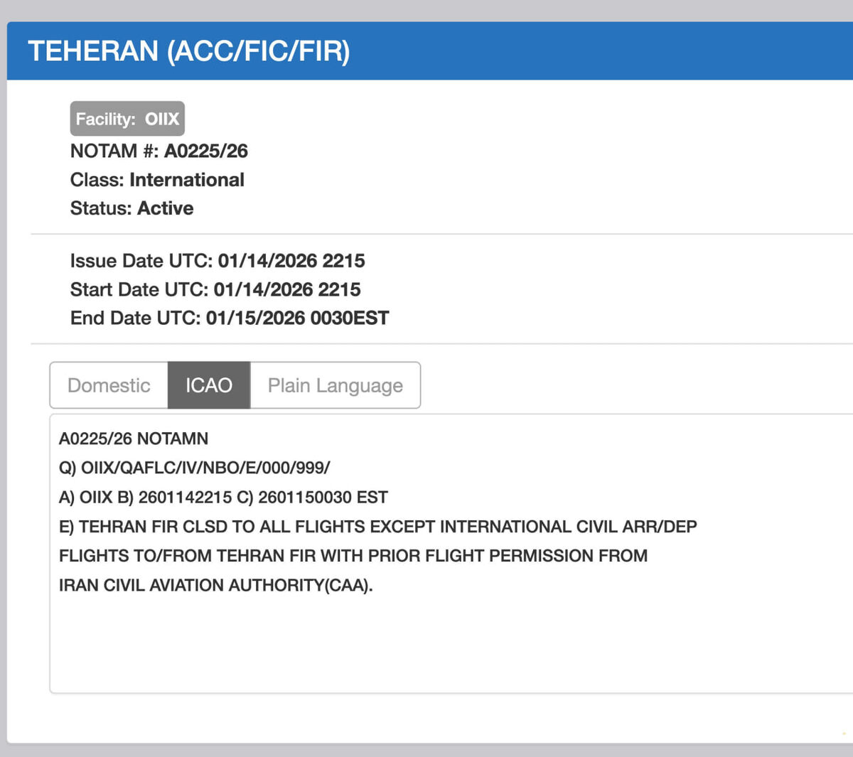 Иран официально закрыл свое воздушное пространство для гражданских самолетов, выпустив соответствующий NOTAM