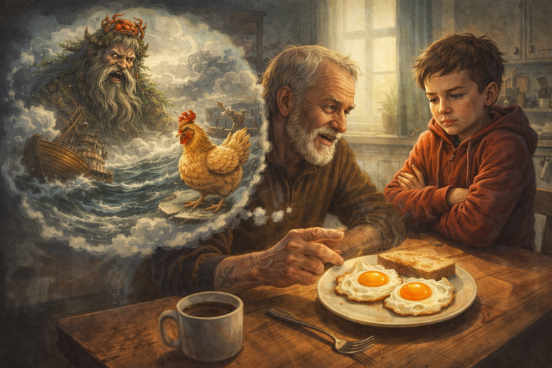 — Не буду! — тарелка с грохотом отодвинулась на край стола. — Не хочу я эти желтки, они на глаза похожи! Я вздохнул. Глубоко так, как вздыхает старый дизельный двигатель, который пытаются завести в мороз. На тарелке лежала идеальная глазунья: желток дрожал, как слеза младенца, белок был поджарен до хрустящей корочки, а тост пах так, что даже у соседей должны были потечь слюнки. Но внук сидел, скрестив руки на груди, и всем своим видом показывал, что он — скала, о которую сейчас разобьется мой кулинарный корабль. — Не будешь, значит? — я отпил кофе. — Дело хозяйское. Только зря ты так. Это ж не простые яйца. Это, брат, история… Мелкий скосил на меня глаз. Любопытство — оно ж как чесотка, не почешешь — не пройдет. — Эту историю мне поведал один старый моряк, — я понизил голос, делая вид, что это государственная тайна. — Страшный был человек, если честно. Руки у него были — чистая наждачка, все в шрамах, кожа грубая, как подметка сапога. Он этими руками канаты рвал, как гнилые нитки. И во