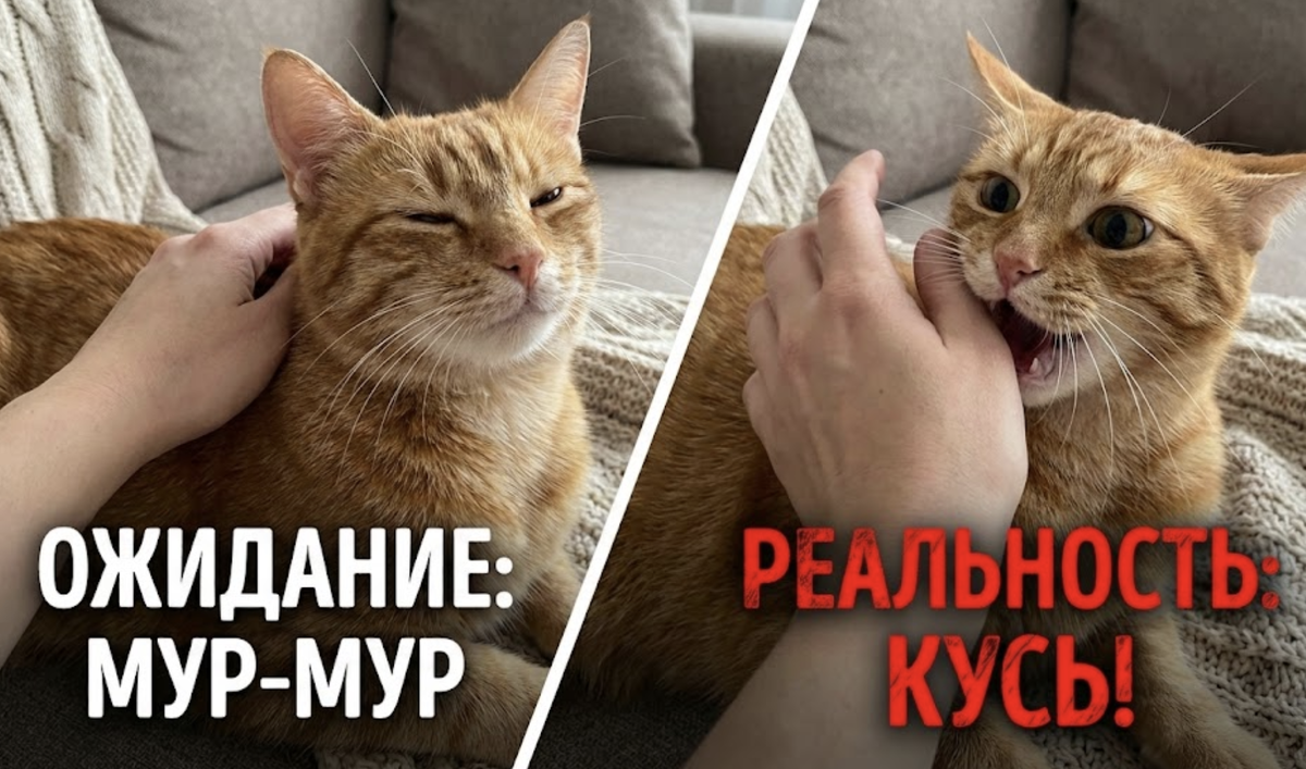 Сценарий всегда один и тот же. Вечер, вы лежите на диване, любимый кот приходит под бок и включает свой «моторчик». Идиллия. Вы гладите его, он жмурится… И вдруг — резкий удар когтями, укус в руку и топот убегающего зверя. Вы сидите в недоумении с царапиной на руке: «За что? Ты же сам пришел! У тебя биполярка?» Сегодня разберем научный термин «агрессия, вызванная лаской» (petting-induced aggression) и научимся вовремя убирать руки. Многие думают, что кот кусает, потому что у него внезапно испортилось настроение. На самом деле, причина в физиологии. Представьте, что кто-то гладит вас по плечу. Сначала приятно. Через минуту - нормально. Через пять минут - начинает раздражать. Через десять минут постоянного трения кожа начинает гореть, и хочется ударить этого человека. У кошек происходит то же самое, но быстрее: Главная ошибка хозяев - мы думаем, что укус происходит внезапно. Нет. Кот кричал вам «ХВАТИТ!» на языке тела последние 30 секунд, но вы продолжали наглаживать. Вот «Желтый сигнал»