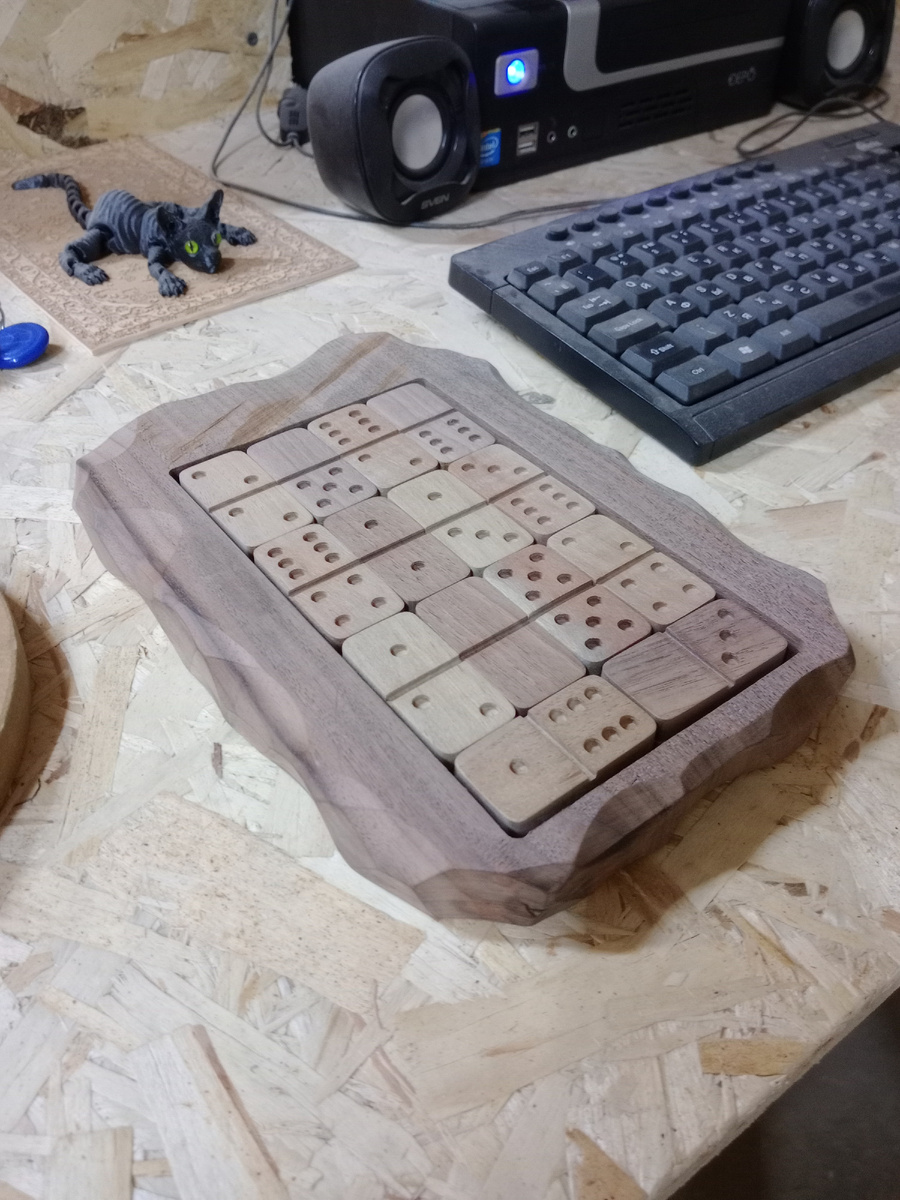 Именно от него делать решил я как-то заморочиться и сделать вручную домино. Могу сказать, что я ожидал лёгкой прогулки , но не тут то было, эти маленькие детали потребовали большой работы и не мало серьезных инструментов . Пришлось использовать не только сверлильный станок но и фрезер, и шлифмашину, и ленточную пилу. Даже и не знаю начал бы я делать это домино если б знал сколько времени и сил