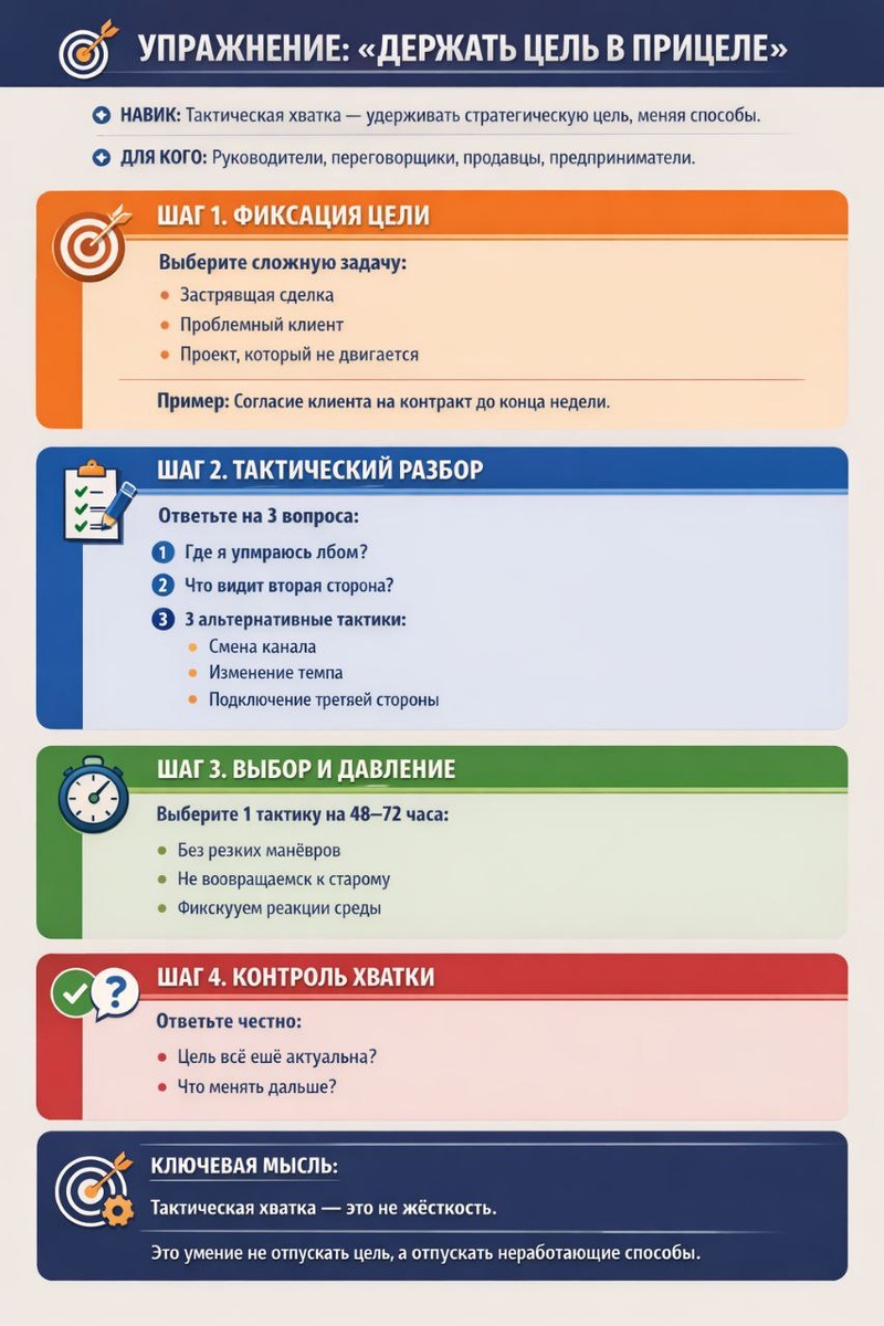 🏹 Упражнение: «Держать цель в прицеле» Навык: Тактическая хватка — удерживать стратегическую цель, постоянно меняя способы движения к ней. Для кого: Руководители, переговорщики, продавцы, предприниматели. Шаг 1. Фиксация цели 🎯 Выберите одну сложную переговорную задачу: застрявшая сделка проблемный клиент проект, который «не двигается» ✏️ Запишите одним предложением, чего хотите достичь (измеримый результат, без «попробовать» или «разобраться»). Пример: получить согласие клиента на новый контракт до конца недели. Шаг 2. Тактический разбор 📝 Ответьте письменно на 3 вопроса: Где я упираюсь лбом? (что не работает сейчас) Что видит в ситуации вторая сторона? (интересы, страхи, ограничения) Какие есть минимум 3 альтернативные тактики? смена канала общения изменение темпа переговоров смена точки входа или аргумента подключение третьей стороны Шаг 3. Выбор и давление ⚡ Выберите одну тактику и действуйте 48–72 часа: без резких манёвров без возврата к старым ходам без эмоциональных решений �