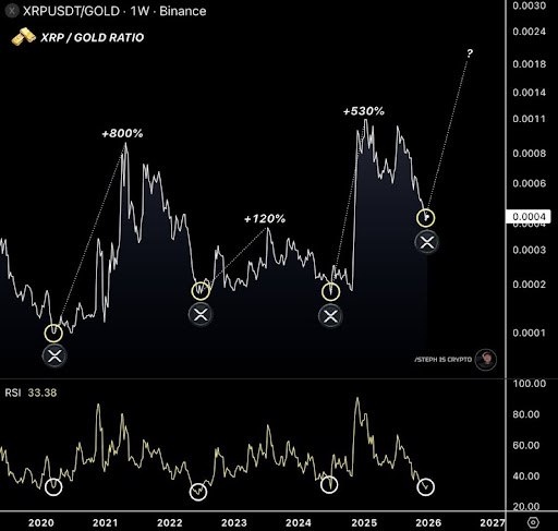 📈 Аналитики отмечают, что соотношение XRP к золоту достигло критического уровня поддержки — 0.0004. Это может свидетельствовать о грядущем значительном росте по аналогии с предыдущими циклами, когда XRP демонстрировал рост на 800% (2020), 120% (2022) и 530% (2024). 📊 Ключевые моменты: - Соотношение XRP/Gold: Достигнута историческая зона поддержки на уровне 0.0004. - RSI: Находится на уровне 33.38, что указывает на перепроданность, аналогичную предыдущим бычьим циклам. - Прогноз роста: Ожидается ралли соотношения XRP/Gold от 0.0004 до 0.0018, что составляет более 350%. - Аналогия с золотом и серебром: XRP может повторить их циклы, готовясь к фазе расширения после распределения и сжатия. - Цель XRP: Прогнозируется достижение нового исторического максимума в $32.