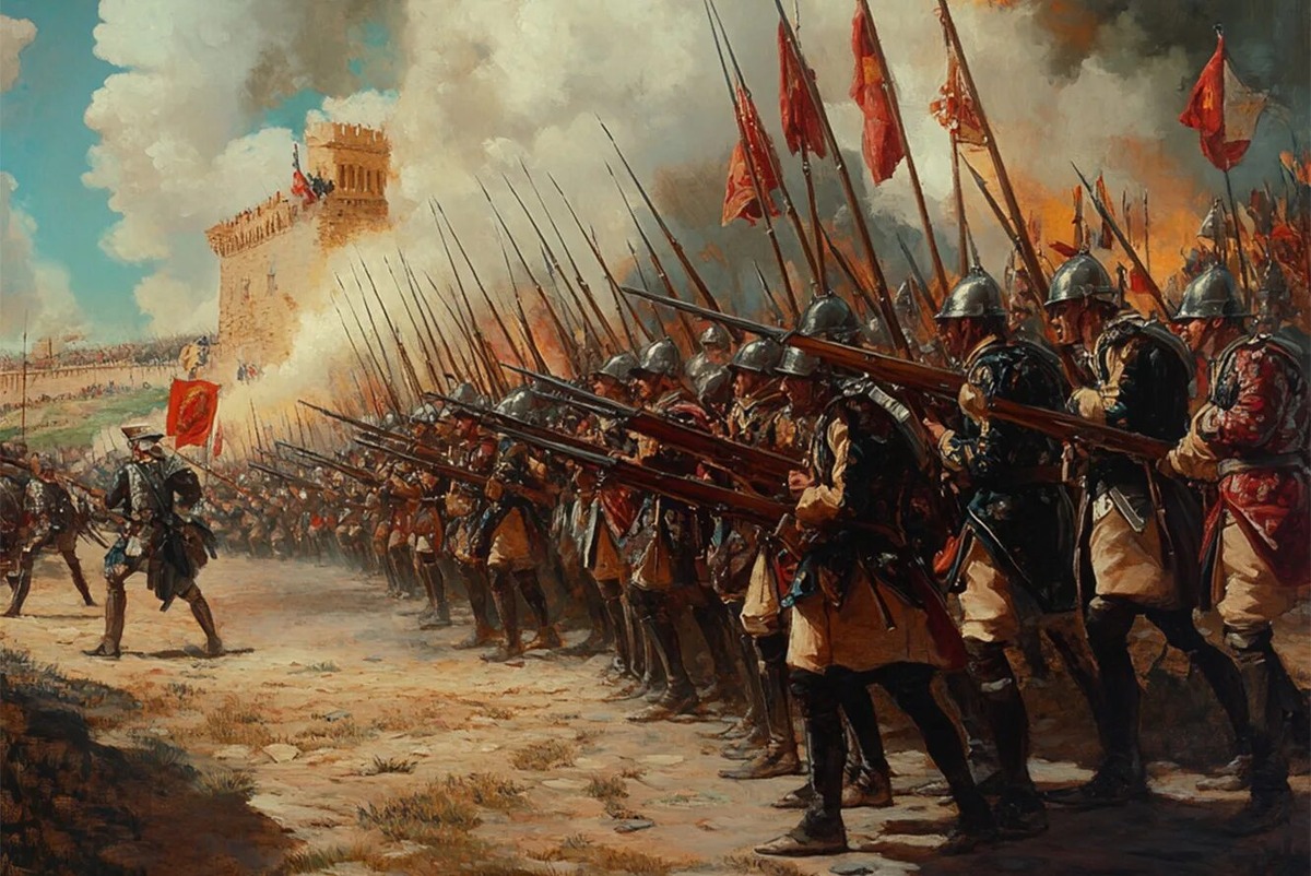 Кульминацией испанской военной революции стало создание терции — принципиально новой тактической единицы, появившейся в ходе итальянских войн начала XVI века. Испанские полководцы, прежде всего Гонсало де Кордоба, осознали, что традиционные громоздкие пехотные массы больше не соответствуют эпохе огнестрельного оружия. Вместо огромных квадратов они создали компактные, манёвренные формирования численностью в несколько тысяч человек, где пикинеры и стрелки действовали как единый механизм. Терции строились в несколько линий, часто в шахматном порядке, что делало их менее уязвимыми для артиллерии и позволяло гибко маневрировать резервами. Если первая линия оказывалась под ударом, её поддерживали вторая и третья, а интервалы между подразделениями превращались в ловушки для противника, обстреливаемого с флангов.