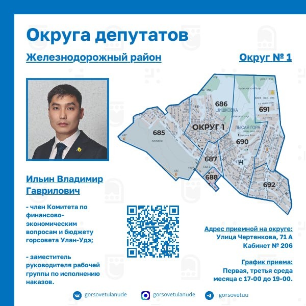 👋Приветствуем, уважаемые улан-удэнцы! 👩💻Начиная с сегодняшнего дня, мы будем выкладывать в нашем профиле актуальную информацию об избирательных округах и закрепленных за ними депутатов. Это будут небольшие публикации-напоминалочки, где будет размещена информация о работе приемных депутатов, перечни улиц, проездов, переулков и микрорайонов города конкретного избирательного округа. 🔷Итак, начинаем с избирательного округа № 1. 🔹Округ № 1 находится на севере Железнодорожного района Улан-Удэ и частично затрагивает Советский район. Расположенный по большей части на возвышенности, он охватывает территорию Шишковки (верхнюю и нижнюю), Лысой горы и немного – территории у реки Селенга. 🔹Депутатом округа является Владимир Гаврилович Ильин, член Комитета по финансово-экономическим вопросам и бюджету горсовета Улан-Удэ, заместитель руководителя рабочей группы по исполнению наказов. 🔹Округ преимущественно занят индивидуальной жилой застройкой, поэтому внимание к благоустройству со сторо