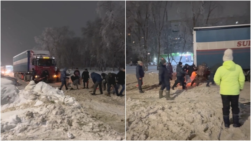 Вчера вечером в Кировском районе Саратова местные жители помогли водителям фур освободиться из снежного плена. Об этом ИА "Взгляд-инфо" рассказали читатели, приславшие видео. На фоне чрезвычайно сложной погодной обстановки, парализовавшей город, саратовцам в очередной раз приходится брать дело в свои руки. На этот раз, поздним вечером 14 января, в микрорайоне "Звезда" порядка 15 мужчин вышли с лопатами на спасение большегрузов, которые застряли на проезжей части. Судя по видео, им пришлось не только откапывать фуры и бензовозы, но и толкать их, когда те пытались выехать. За этими событиями наблюдали из окон жители многоэтажек, которые высоко оценили такой поступок соседей.