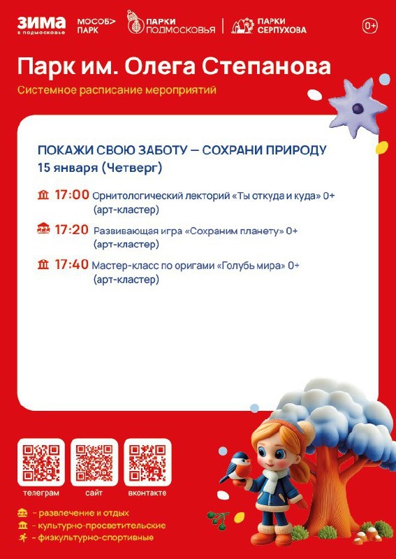 ✨ Сегодня вечером в парке 🔹17:00 Орнитологический лекторий «Ты откуда и куда» 0+ (арт-кластер) 🔹17:20 Развивающая игра «Сохраним планету» 0+ (арт-кластер) 🔹17:40 Мастер-класс по оригами «Голубь мира" 0+ (арт-кластер) 🚫 Возраст: 0+ 📆 15.01.2026 🏢 Парк им.Олега Степанова 📍 г. Серпухов, ул. Луначарского, д.74 💰 Вход свободный❗️ ⭐Поддержать канал голосом 💰 Канал Вакансии Серпухова ✅ Мероприятия Серпухов https://dzen.ru/id/66f01c6eb4c6fe60c9ca1608 http://vk.com/serpukhov_events http://dzen.ru/serpukhov_events