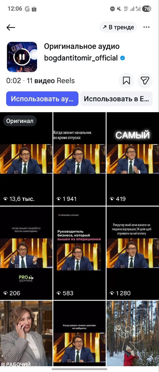 Возьмите смешной момент из жизни или вашего интервью, выложите его в пробном режиме в инстаграм, отразите изображение и выложите снова (чтобы получился уникальный контент). Добавьте забавные надписи на разные популярные темы (работа, психология, отношения, знаки зодиака), сделайте такие же надписи на отраженном видео. Так же можете добавить для привлечения внимания стартовое видео с текстом в качестве обложки на пару секунд. Сделайте из одного видео 50 единиц уникального контента, отправьте его в пробный режим. Найдите аккаунты или каналы в соцсетях и мессенджерах, где люди ищут исходники мемов, отправьте им исходник для публикации. В итоге вы можете получить значок вашего звука "в тренде" (как вот здесь) и наберёте UGC, что и способствует продвижению вас как персонажа и возможно фрагмента вашего трека. И все это бесплатно. А если ты ничего не понял что и как делать, можешь записаться ко мне на платную консультацию, разберем твой продукт, составим план продвижения. Пиши: @okhanov