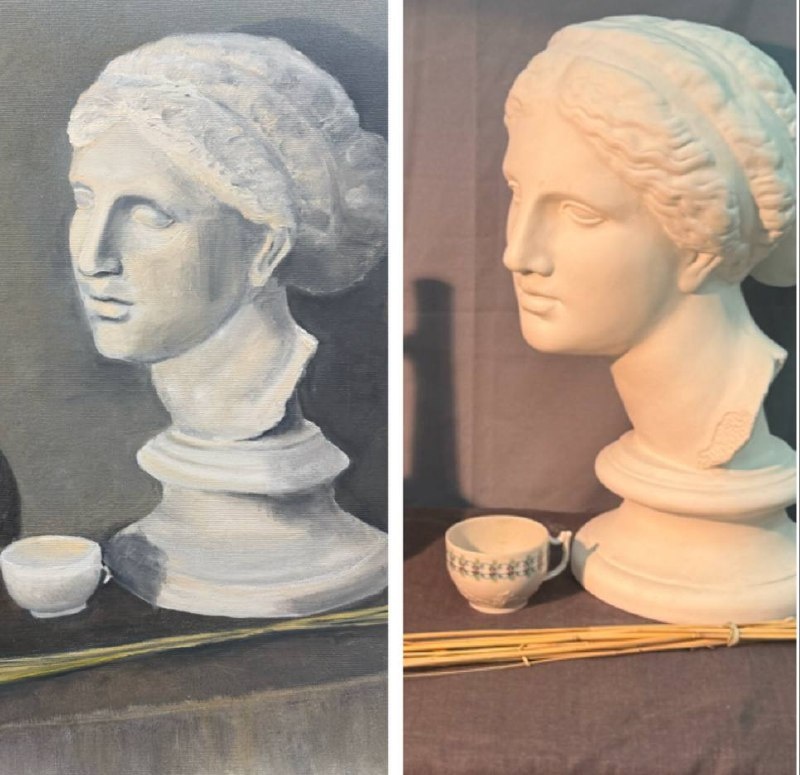 Всегда завидовала терпеливым, усидчивым людям. Белой завистью, естественно. Например: у меня в школе были подружки, которые усиленно что-то вязали. И, на самом заключительном этапе, увидев какую-то неправильную петлю в кофточке, они с лёгкостью все это распускали и начинали заново. Я бы, честно, скорее кофточку пустила на половичок 🤦♀️. Именно терпения и олимпийского спокойствия мне не хватило в случае с головой. Как я уже рассказывала, в прошлом году ходила в Суриковский институт на начальный курс по живописи маслом. На одном из завершающих в первой ступени уроков мы делали рисунок гипсовой головы Венеры Милосской. У меня, как-то с ходу, все неплохо пошло😉. Преподаватель подходил ко мне все чаще и чаще, и по одобрительному хмыканью, я поняла, что дело идёт отлично. Потом мы оставили работы в специальном месте для хранения. А через неделю я радостно поскакала дорисовывать свою голову. Мы устроились за мольбертами. Смотрю у моей головы нос какой-то не такой. Начала перерисовыват