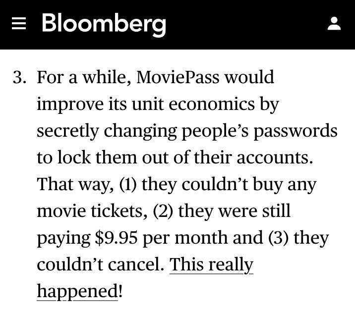 Красаучеги :) Без лоха в ИТ и жизнь плоха. Особенно с подписками. Цитирую, если плохо с анг.: "Одно время MoviePass "оптимизировал свою юнит-экономику" просто гениально: они втихую меняли пользователям пароли, чтобы те не могли попасть в свои аккаунты. Схема — огонь: билеты в кино купить невозможно; 9,95 баксов в месяц продолжают исправно списываться; и, вишенка на торте, отменить подписку тоже нельзя." Ирония здесь в том, что термин «юнит-экономика» (обычно означающий сложные расчеты прибыльности одного клиента) здесь используется для описания банального мошенничества и блокировки пользователей, чтобы те просто не могли тратить деньги компании, но продолжали платить. Русский ИТ бизнес
