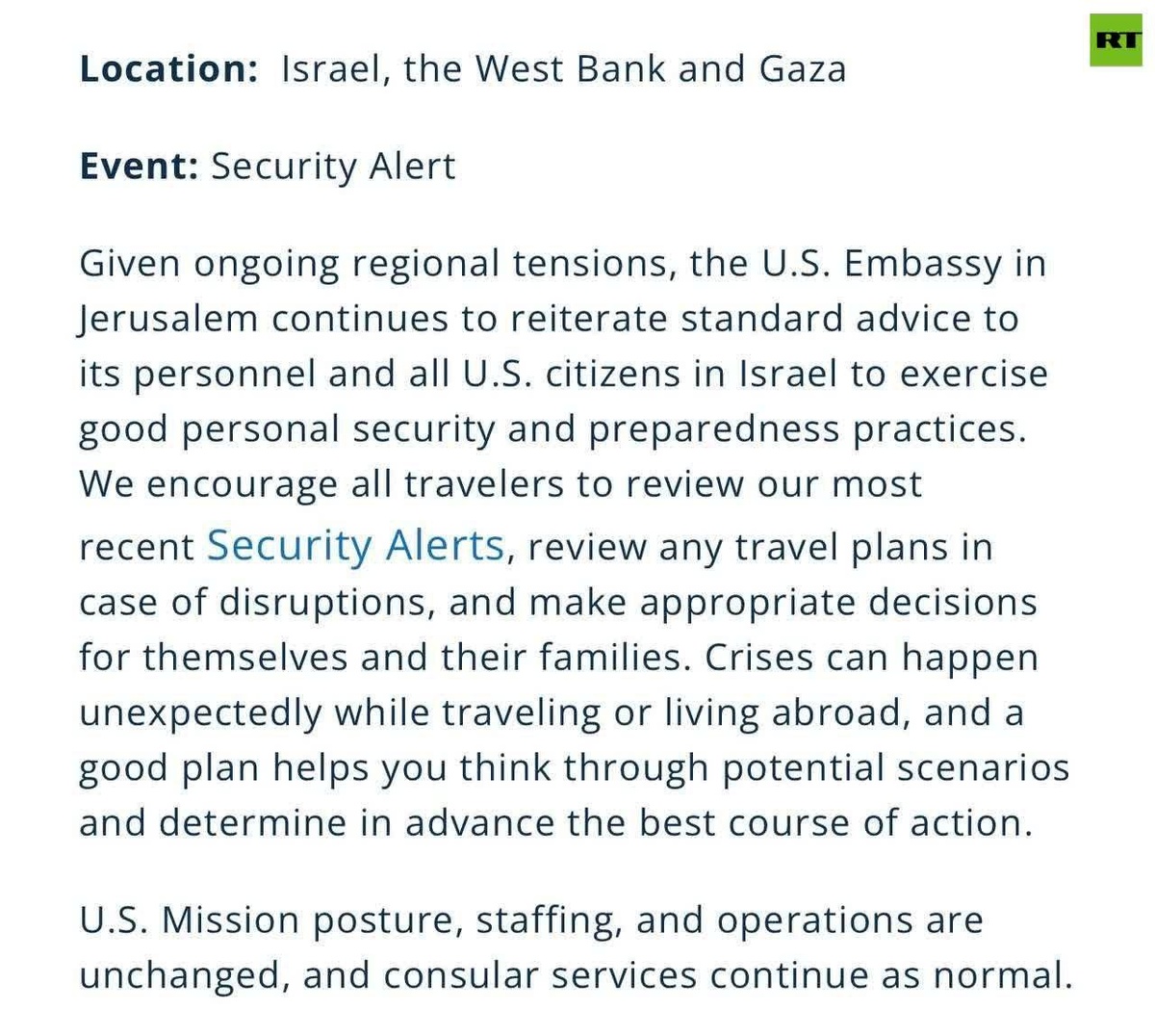 US Embassy in Jerusalem issues security alert to 'review any travel plans in case of disruptions