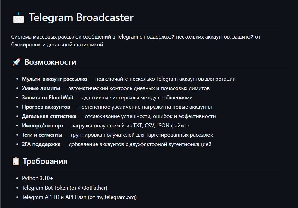 🚀 Telegram Broadcaster — Локальный сервис массовых рассылок в личные сообщения 📋 О проекте Telegram Broadcaster это полнофункциональный инструмент для автоматизированной рассылки сообщений в личные сообщения Telegram. Проект разработан на Python с использованием современного асинхронного стека и предназначен для маркетологов, предпринимателей и команд, которым необходимо эффективно коммуницировать с аудиторией через Telegram. Система работает локально на вашем компьютере, что обеспечивает полный контроль над данными и исключает зависимость от сторонних сервисов. Управление осуществляется через удобного Telegram-бота с интуитивным интерфейсом. 🛠 Технологический стек Проект построен на проверенных технологиях: Python 3.12 как основа, aiogram 3.x для управляющего бота, Pyrogram для отправки сообщений через пользовательские аккаунты, SQLite для хранения данных, APScheduler для планирования задач, aiohttp-socks для работы с прокси. Такой стек обеспечивает высокую производительность