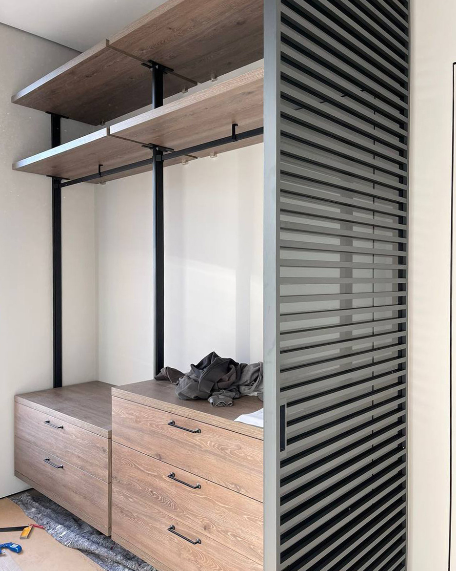 Ещё одно решение в этом доме в КП «Современный квартал» — перегородки серии Loft, отличающиеся по конструкции, но выполненные в той же отделке алюминиевого профиля в цвете антрацит. Эти перегородки также ведут в гардеробную, но уже другую. В отличие от предыдущего решения, здесь мы использовали обычное прозрачное стекло. Если в прошлом примере приватность достигалась за счёт рифлёного стекла, то в данном случае она формируется самой конструкцией перегородки и её геометрией. Такой приём позволяет сохранить визуальную чистоту и глубину пространства, оставаясь в рамках единой стилистики интерьера, который продолжает формироваться и наполняться деталями.