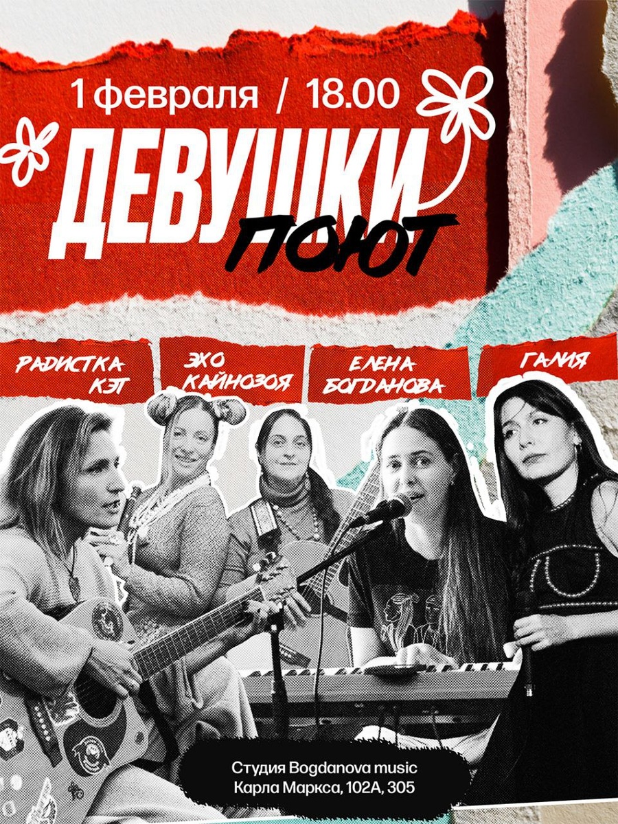 😁 0⃣1⃣.0⃣2⃣ 18.00 в пространстве Елены Богдановой (Карла Маркса, 102а, 305) состоится концерт-сборник под названием "Девушки поют" Поскольку выступающих артистов/коллективов будет 4 («Галия», «Эхо кайнозоя», «Радистка Кэт», Елена Богданова), а вместимость зала не велика, мы договорились поделить по 6 билетов на группу. Мероприятие уникальное!!! Стоимость 700 р. Атмосфера камерная. Звучание акустическое. Мы все такие разные! Кажется, простраство пошатнётся от сочетания такой разной музыки и таких разных женских энергий! Не пропустите это пошатание😁 За билетами пишите мне в личку @KaynoZoya У НАС ВСЕГО 6 БИЛЕТОВ!