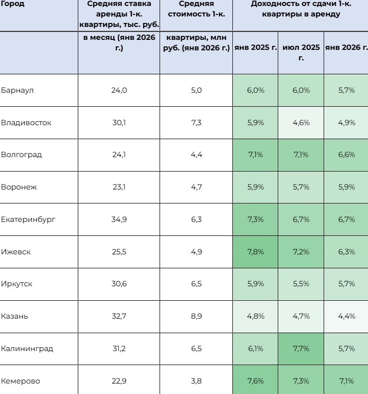 ». Это если касаться однокомнатной квартиры, приобретённой на вторичном рынке. Средняя цена за месяц у однушки — 30,1 тысячи рублей при стоимости в 7,3 миллиона рублей. Из-за подорожавшего квадратного метра доходность с аренды снизилась на 1% относительно января 2025 года, но поднялась на 0,3% в сравнении с июлем 2025 года — тогда он был 4,6%. Во второй половине 2025 года начала постепенно снижаться ключевая ставка. Как следствие, ниже стали и ставки по депозитам в банках. В начале 2026-го вклады сроком от 1 года до 3 лет в крупнейших банках предлагаются под 6–13% годовых, а ставки по более коротким депозитам достигают 16%. На январь 2026 года во всех крупных городах РФ покупать квартиру для сдачи в аренду менее выгодно, чем положить деньги под процент в банк. 🟥Подписаться в Telegram | Предложить новость ➡️Подписаться в MAX