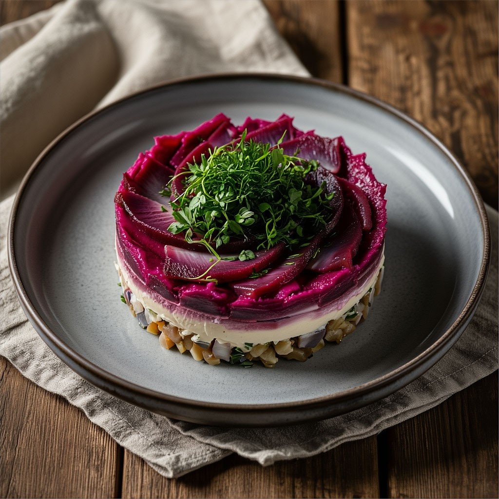 Слои укладываются в порядке от самого сильного вкуса (сельдь) к самому нейтральному (свёкла). Это создаёт плавный переход, а не “удар соли”. А отсутствие майонеза сверху — сохраняет яркий цвет свёклы.