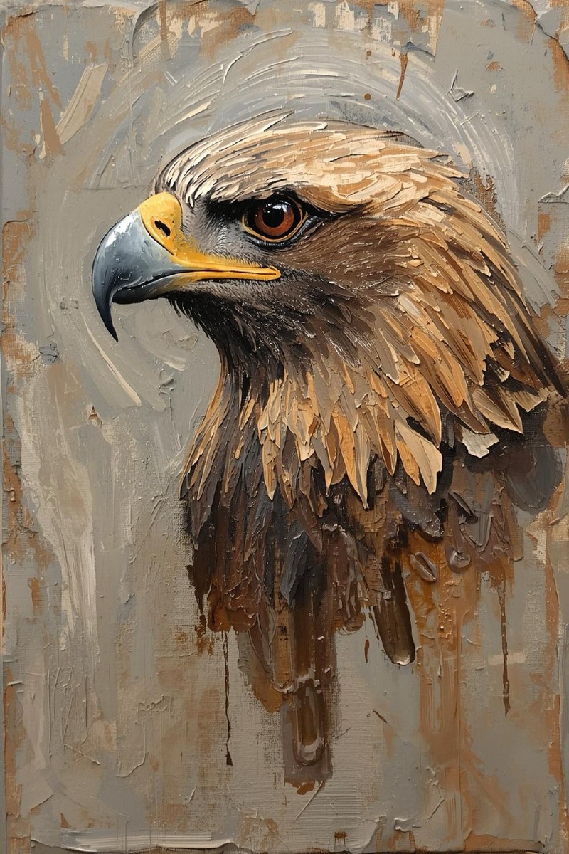 🗣 #Prompt : Thick impasto impressionist painting of a profile view of the head of a eagle with visible brushstrokes and textured layers of paint in earthy tones, painted on a cold gray tan canvas that subtly shows through in areas where the paint is thin, allowing the natural texture of the canvas to be visible, with the eagle 's fur depicted in loose, expressive strokes and its features slightly blurred, giving the painting a soft, dreamy quality, and the overall effect is one of rustic, natural beauty, with the faded edges of the painting blending seamlessly into the canvas. #gemini #midjourney #grok #leonardoai #DALLE3 #stablediffusion #aiart #aiartist #neuralnetworks #deeplearning #aicommunity #aifantasyart #aifantasy #artificialintelligence #discord #beyondart #midjourneyai #graphicdesign Leonardo.ai