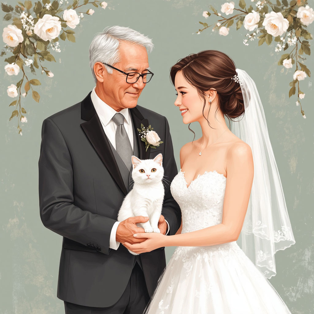 - общий план — невеста и кошка, две «беленькие» души, рядом с ней — любимый человек за кадром.