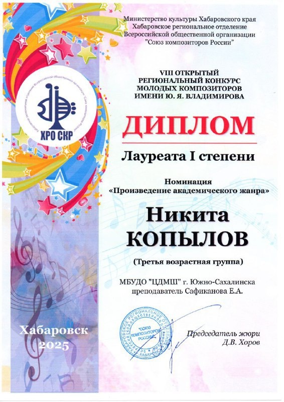 🥇 Лауреатом I степени VIII Открытого регионального конкурса молодых композиторов имени Ю. Я. Владимирова. Под руководством опытного преподавателя музыкально-теоретических дисциплин ЦДМШ Евгении Амуровны Сафикановой он представил своё произведение «Надоедливая муха» в номинации «Произведение академического жанра».🎼 🎶 Сейчас Никита активно участвует в подготовке к уникальному событию музыкального мира - мировой премьере первой симфонии для гитарного оркестра! Это событие станет настоящим праздником для любителей классической музыки, ведь впервые такое масштабное произведение исполнят молодые музыканты нашего гитарного оркестра «Грифон», в составе которого Никита выступает с момента основания коллектива. 🎇 Концерт состоится 27 февраля 🎶 🎟 Билеты уже в продаже: https://cultsakhalin.ru/events/21174/koncert-simfoniya-grifon @cdmshsakhalin