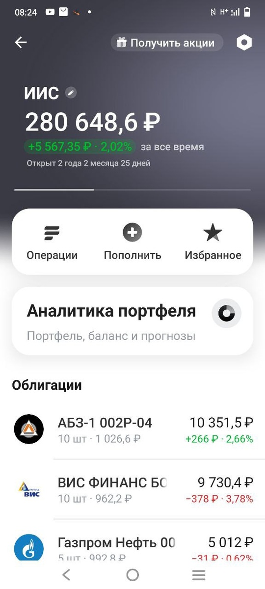 Параллельно с банковскими вкладами активно развивалась моя инвестиционная стратегия на ИИС. К концу года сумма на моём индивидуальном инвестиционном счёте составила 280 тысяч рублей.