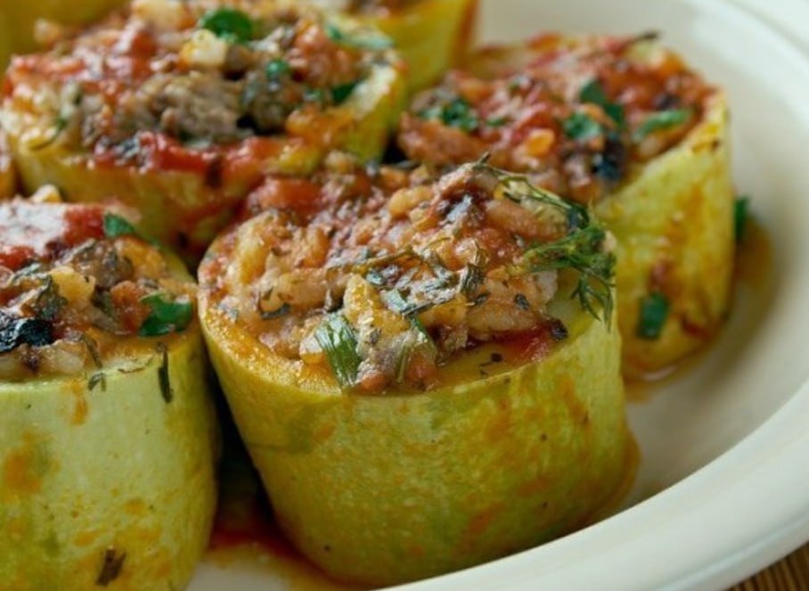 ? Классические фаршированные кабачки с мясом 🤩 идеально вписываются в новую пищевую пирамиду В классическом варианте фаршированных кабачков в мясной фарш добавляют овощи, рис (гречку, киноа, булгур) и свежую зелень. Это делает блюдо более сочным. Кабачки лучше взять небольшие. Фарш из свинины и говядины. 🤩Кабачки - 3 шт. 🤩Фарш - 800 г 🤩Рис - 3 ст. л. 🤩Морковь - 1 шт. 🤩Зелень петрушки - 3 ст. л. 🤩Репчатый лук - 2 шт. 🤩Растительное масло - 2 ст. л. 🤩Соль, черный молотый перец - по вкусу 🤩Томатная паста - 2 ст. л. 🤩Чеснок 2 зубчика 1. Рис отварите до полуготовности. Остудите. 2. Смешайте с фаршем. 3. Мелко нарубите половину моркови и одну луковицу, добавьте к фаршу. 4. Зелень вымойте и нашинкуйте. Смешайте с приготовленной ранее начинкой, посолите и поперчите. 5. Нарежьте молодые кабачки поперек на 3—4 части. Извлеките мякоть, сформировав «стаканчики» с небольшими стенками. 6. В объемной кастрюле вскипятите воду и окуните в нее на 2—4 минуты подготовленные кабачки.
