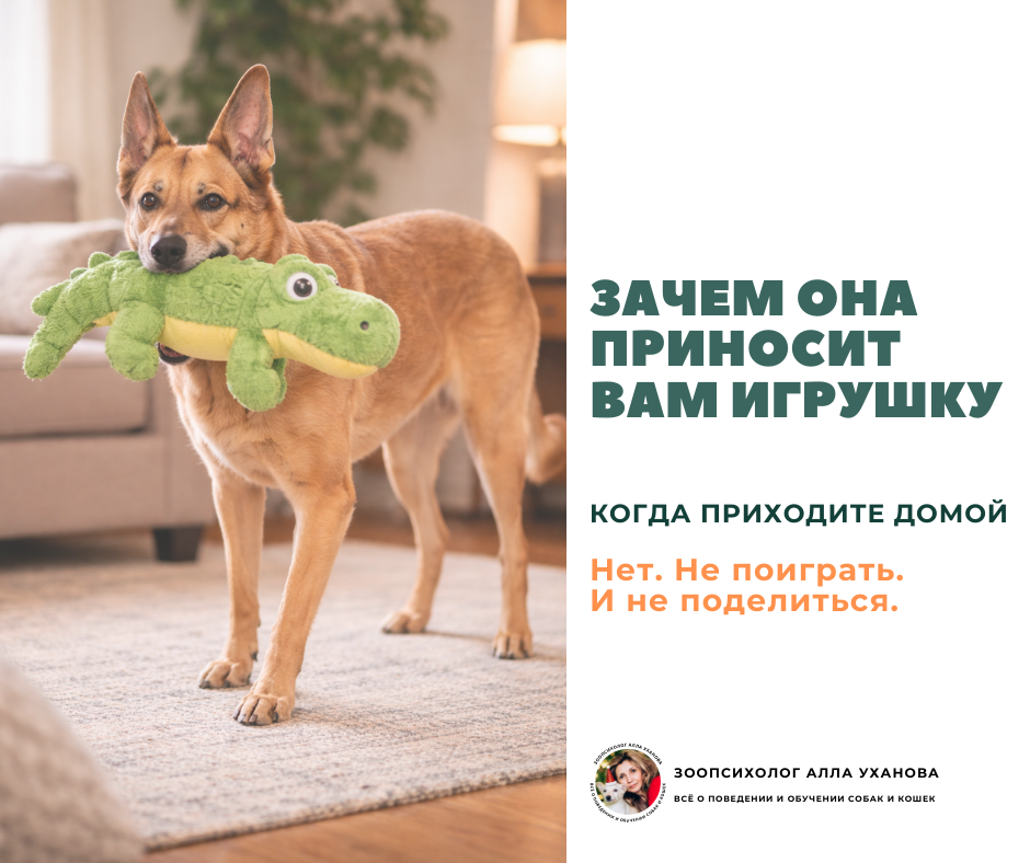 Собака встречает вас у двери с игрушкой в зубах, виляет хвостом так, что попа вот-вот оторвется. Что это значит? Зовет поиграть? Делится игрушкой? Нет, причина другая. Моя собака Гита (её не стало в 2023-м) встречала меня именно так. Она не просто радовалась, а искала, во что вцепиться зубами. Иногда это была игрушка, но чаще — край моей юбки. Она брала юбку зубами и водила меня по комнате... Тогда я еще не знала о собаках почти ничего, но интуитивно понимала: она не играет. Она так успокаивается. Эта игрушка - не для вас. Она для нервной системы собаки. БИОЛОГИЯ “ЗАХВАТА”. Приход её человека для собаки — это эмоциональный взрыв. Гормоны заполняют её эмоциональную чашу до краев. Собаке необходимо сбросить это напряжение. Жевание или удержание предмета в зубах — это один из способов снизить уровень возбуждения. Она сама себя успокаивает. Мы называем это саморегуляцией. Почему не игрушка, а юбка? Если под рукой нет игрушки, собака хватает то, что ближе: ваши руки, одежду, поводок. Важн