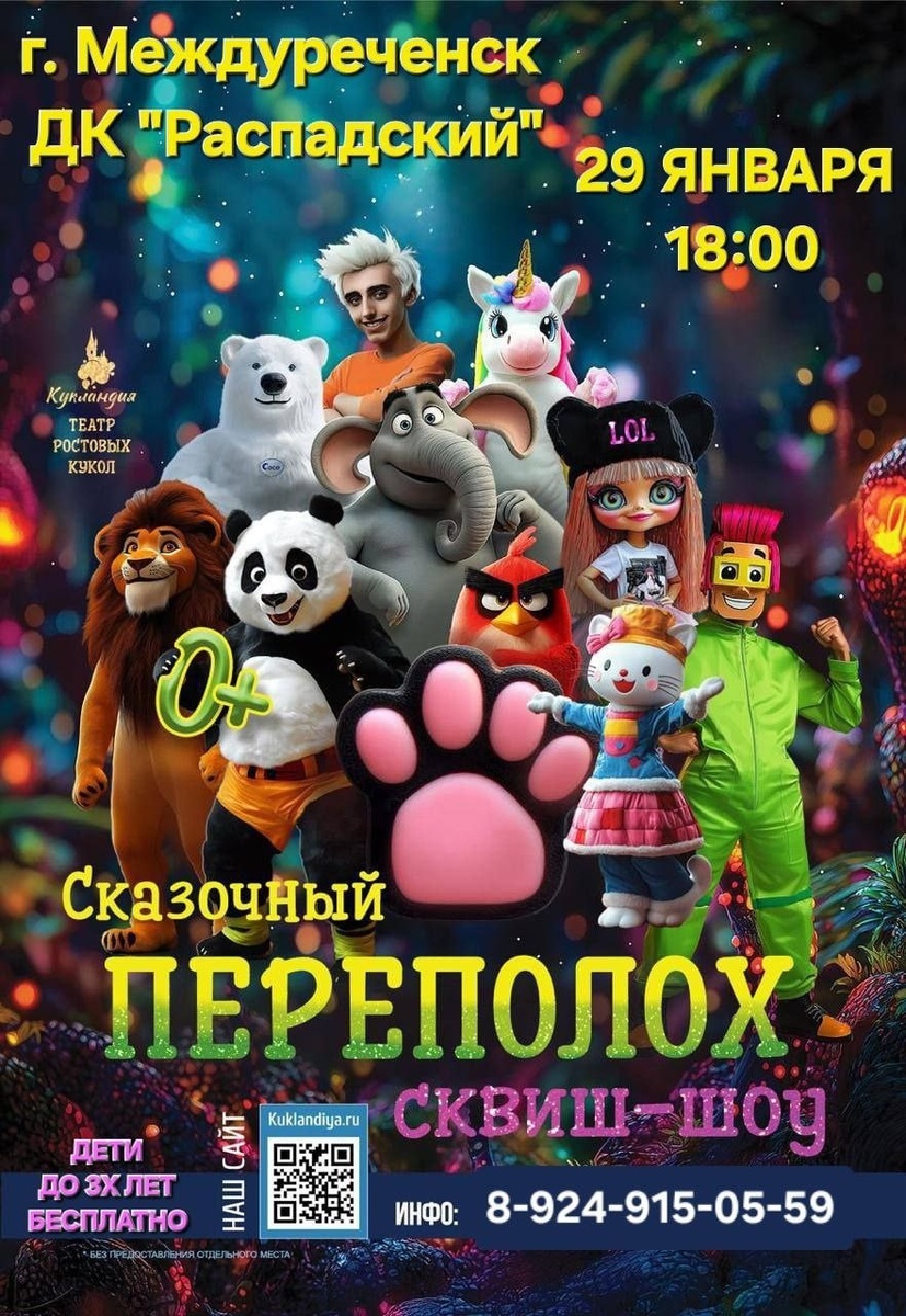 📢📢📢📢📢📢📢 ⚡️г. Междуреченск ⚡️ 🗓 29 Января 🕰18:00 🏛ДК"Распадский" ул.Весенняя 9 ✅Продажа билетов: 🔴 ТОЛЬКО НА САЙТЕ 🔴 🔴 kuklandiya.ru 🎫-600-700-800 📲инфо: 8-924-915-05-59 🪄Дети до 3-х лет бесплатно (включительно) 😀Сенсация!!!😀 СКАЗОЧНЫЙ ПЕРЕПОЛОХ… Хотите попасть в сказку? Тогда вместе с нашими героями отправляемся в путешествие. День рождения Кошечки-Лапки обернулся для неё настоящей катастрофой, ведь пропал её лучший друг Мишка. Наша отважная Кошечка отправляется на поиски. Для спасения Мишки ей понадобятся: мудрость слона Хортона, талант Куроми и Китти, обаяние Единорожки и Лолки, храбрость Панды и геймерская игра Роблокса и Ниндзяги. Но самое интересное тебя ждёт впереди. Тебе предстоит разгадать загадку всей нашей сказки. Вас ждут море улыбок, голографическое шоу, бой подушками, гигантские мячи, полет воздушной Лапки, шоу мыльных пузырей, лазерное шоу и океан эмоций. Встретимся на нашем шоу!!! ✨😀😀 Рекламодатель МБУК ДК «Распадский» Токен 2VtzqwwuNRx