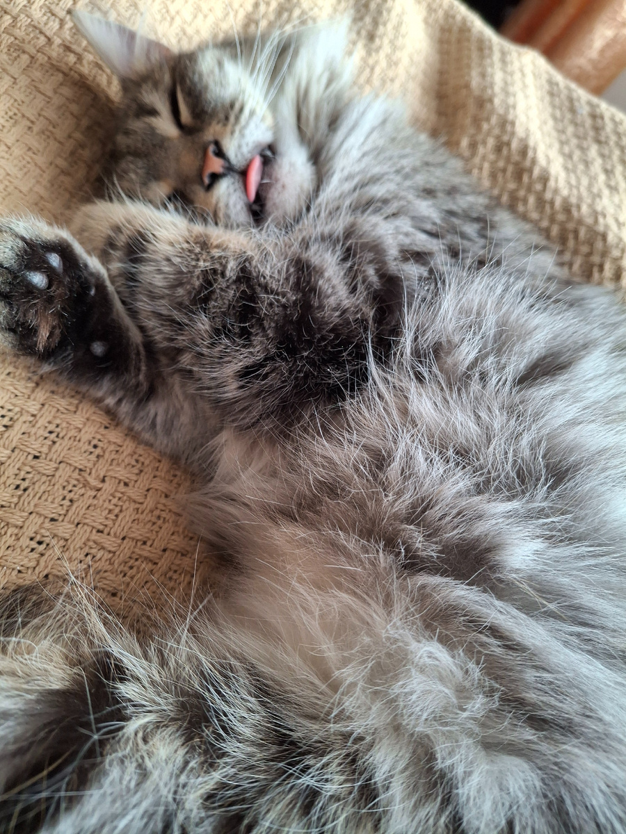 Но одно радует, стала она иногда на спине спать, а то только клубочком свернется, а ушки всё равно на макушке держит. Вот последние время может расстянуться, пузико своё показать, пушистое, кудрявое, все свои прелести кошачьи мохнатыми штанишками прикрытые, не то что у дочкиных котов-разбойников.