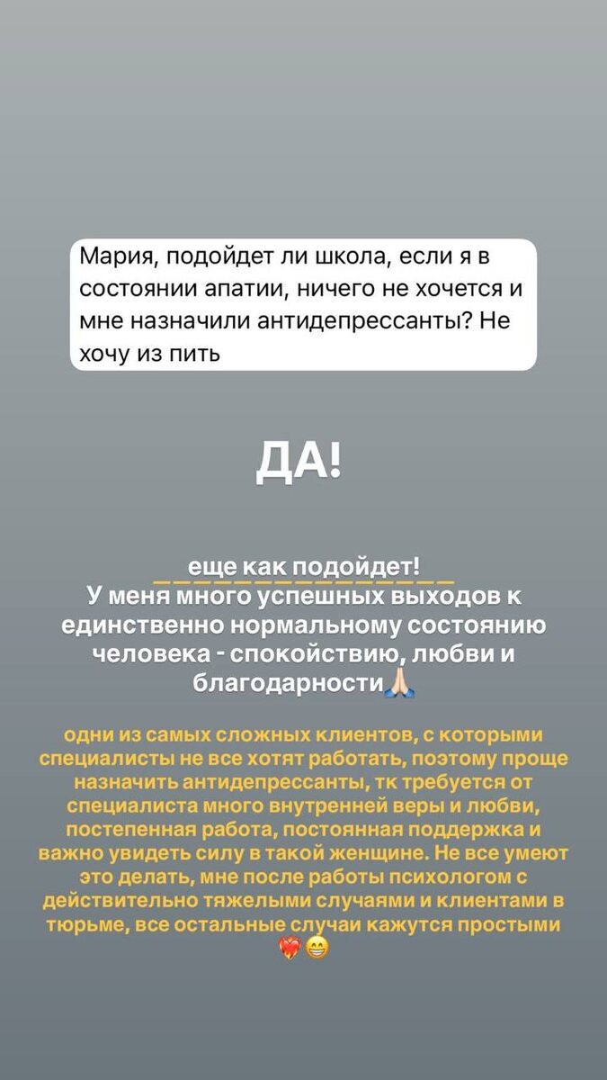 ДА!!! и чем быстрее, тем вам будет проще вернуться в нормальное состояние. 🙏🏻 Всё возможно! От Вас нужно желание, включенность и следование рекомендациям. К сожалению я вижу такую картину, что 45-50% женщин назначают сразу препараты, еще и говоря что «психологи вам не помогут» и отчасти я даже соглашусь! Обычная сессия не поможет! И возможно даже многие специалисты не справятся, потому что при выходе из такого состояния требуется наблюдение за вами ежедневное, регулярное, практически как стационар в больнице А может ли обычная сессия с психологом вам это обеспечить? Нет! Но только не ШКОЛА ЖИЗНИ ПО-ЖЕНСКИ Школа направлена на регулярный контакт с ученицей, постоянное наблюдение за динамикой изменений и коррекцию в случае необходимости ШКОЛА ЖИЗНИ ПО-ЖЕНСКИ - это как «лечение» в больнице, только речь идет о МЕНТАЛЬНОМ ЗДОРОВЬЕ сама концепция Школы и заключается в том, чтобы вести женщину до её твердого постоянного кайфового состояния это уникальный проект! Я не знаю т