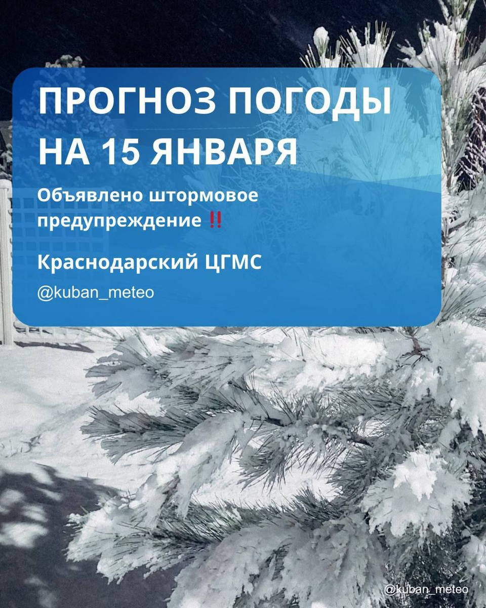 ☁️⛅⛈️ ❄️ Четверг, 15 января 📍 Краснодарский край Облачно с прояснениями. 🌨 Осадки в виде дождя, мокрого снега и снега, местами сильные осадки. 🌫 В отдельных районах туман. ⚠️ Комплекс метеорологических явлений (КМЯ): — гололёдно-изморозевое отложение — сильный ветер с порывами 15–20 м/с, — в отдельных районах порывы 20–25 м/с ⚠️ Опасные явления (ОЯ): — очень сильные осадки в виде мокрого снега, дождя со снегом — очень сильный снег — сильное налипание мокрого снега на проводах и деревьях ⚠️ Гололёд. ⚠️ На дорогах гололедица. 💨 Ветер южной четверти 4–9 м/с, местами порывы 12–14 м/с. 🌡 Температура воздуха: ночью –5…–10°, местами при прояснении –11…–16°; днём –2…+3°, в северной половине края до –5°; 🏔 в горах ночью –12…–17°, днём –8…–13°; 🌊 на Черноморском побережье ночью 0…–5°, днём 2…7°. 📍 По г. Краснодару Облачно с прояснениями. 🌨 Ночью преимущественно без осадков, утром и днём осадки в виде мокрого снега и снега. ⚠️ Гололёдно-изморозевое отложение, налипание мокрого сне
