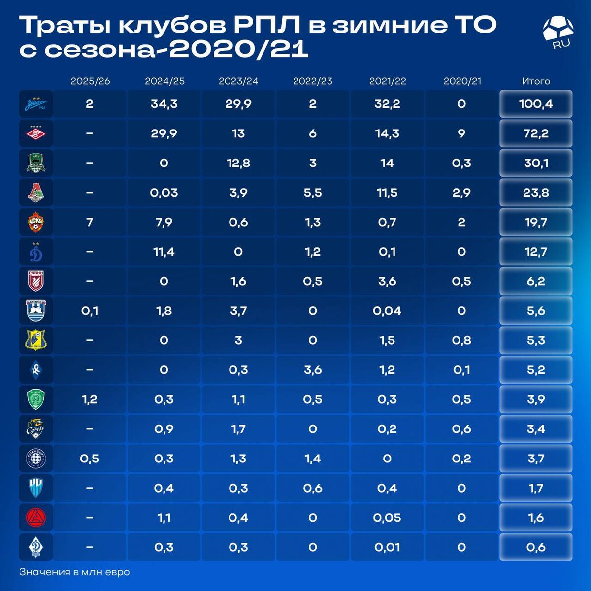 Расходы клубов в зимнее трансферное окно с сезона 20/21